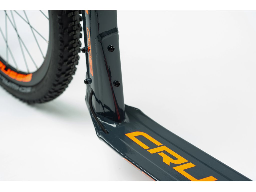 Hliníková koloběžka do terénu CROSS 6.2 na špičkových kotoučových hydraulických brzdách SRAM s průměrem kol 26"×20“, hmotností 10,870 kg, odpruženou vidlici SUNTOUR a na MTB pláštích SCHWALBE. Koloběžka je ideální do náročnějšího terénu na sjezdy či akční jízdu se psem.