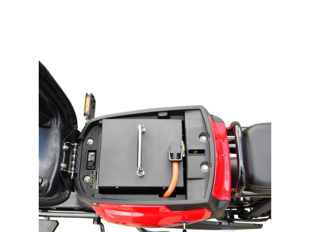 Skútr je vybaven LITHIOVOU vyjímatelnou baterií o kapacitě 19Ah, kterou si můžete odnést domů nabít, je však možnost dokoupit a zaměnit za lithiovou baterii 40 Ah s dojezdem přes 100 respektive 150km.