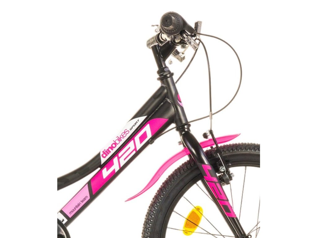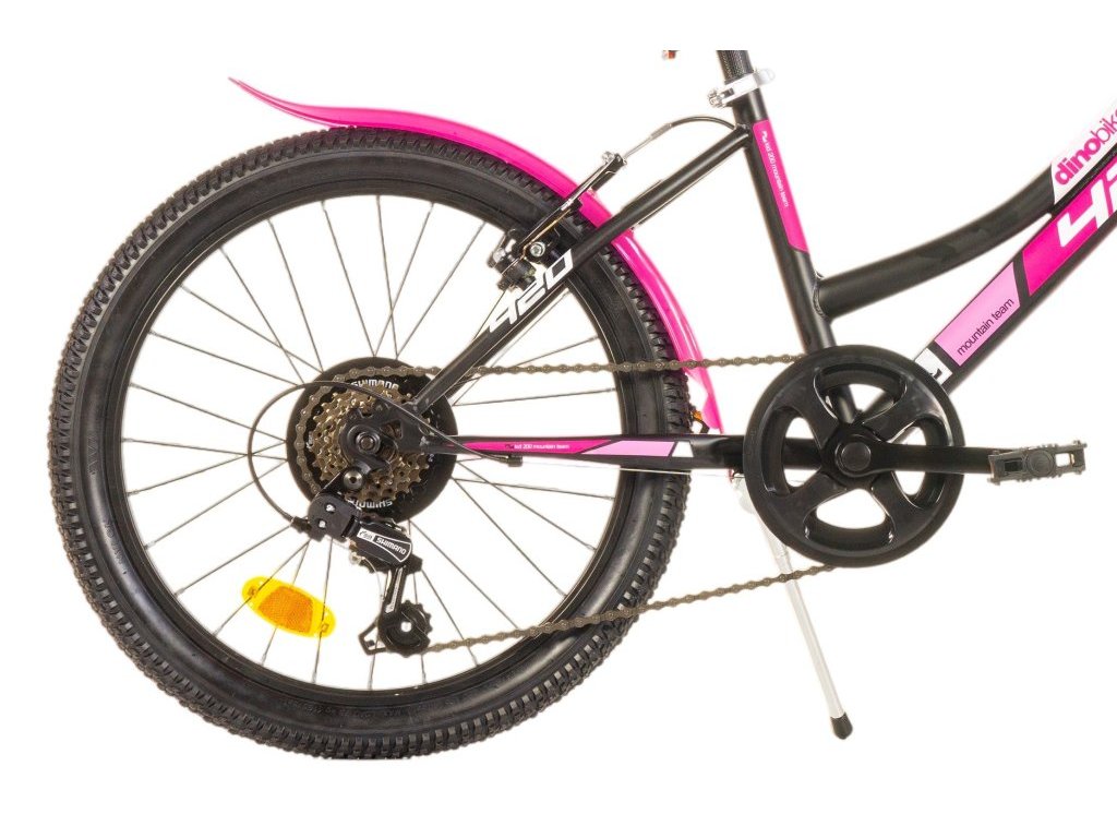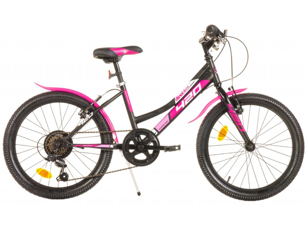 Juniorské kolo Dino Bikes se vyznačuje propracovaným designem dávajícím kolu sportovní vzhled. Jde o horské kolo pro mladé sportovkyně. Velkou výhodou všech našich kol italské výroby je, že JSOU SEŘÍZENÁ PRO PROVOZ A NA 95% SMONTOVANÁ. Zbývá pouze nasadit řídítka, sedlo a připevnit případně blatníčky (pokud jsou součástí kola). Kolo má hliníkové ráfky 20 palců = 51 cm, dvouvrstvé nafukovací pláště s jemným vzorkem na silnici i do nenáročného terénu o rozměrech 20" x 2,125", ocelovou vidlici, volnoběh na zadním kole. Sedlo lze nastavit do výšky 56 - 68 cm. Kolo je vyrobeno s odlehčeným vyztuženým rámem z Hi-ten oceli. Součástí výbavy je stojánek na kolo, zvonek. Kolo má přední a zadní velmi účinné "V-brzdy" a otočné Grip Shift - šestistupňové převody Shimano TZ-20 se 14/28 zubů s řazením na rukojetích řídítek. Na kole jsou dva malé plastové blatníčky a tenký kryt řetězu v barvě kola.