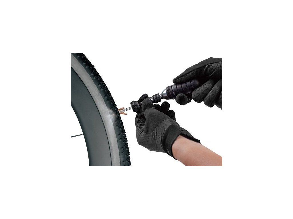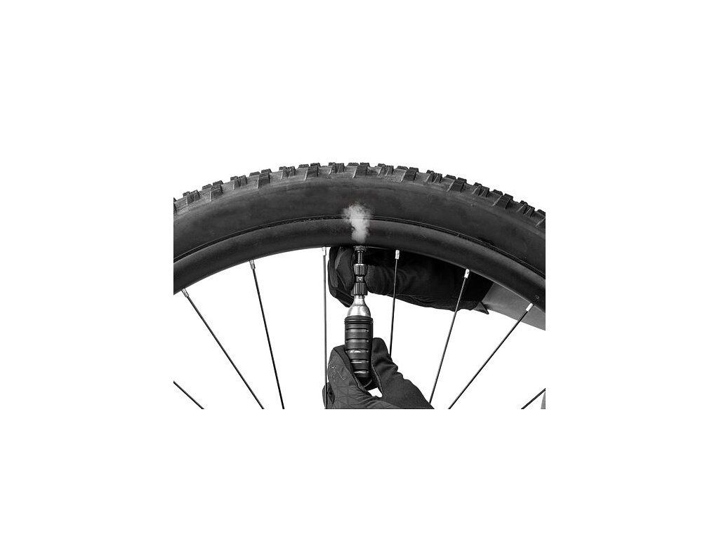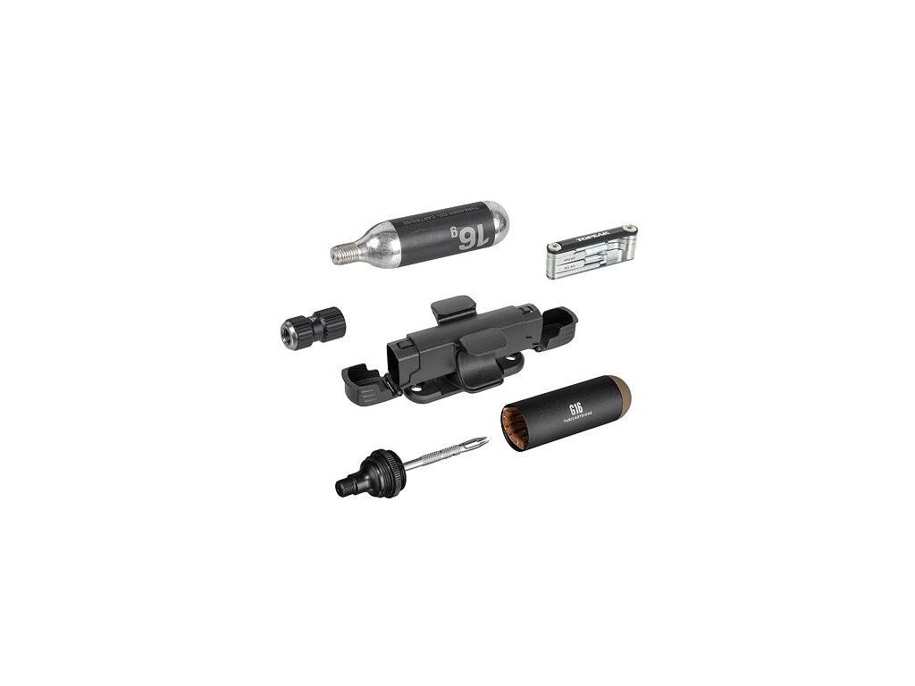 Sada na opravu bezdušových pneumatik. Obsahuje mini nářadí s devíti funkcemi, hustilku Nano AirBooster CO2, 16g kartuši CO2 a TubiCartrdige G16, která se dá kompaktně sbalit a připevnit na rám, sedlovku nebo držák láhve na vodu pomocí přiloženého držáku. Snadno přístupné jednoduchým otočením pro základní údržbu kola nebo opravu a huštění bezdušových plášťů.