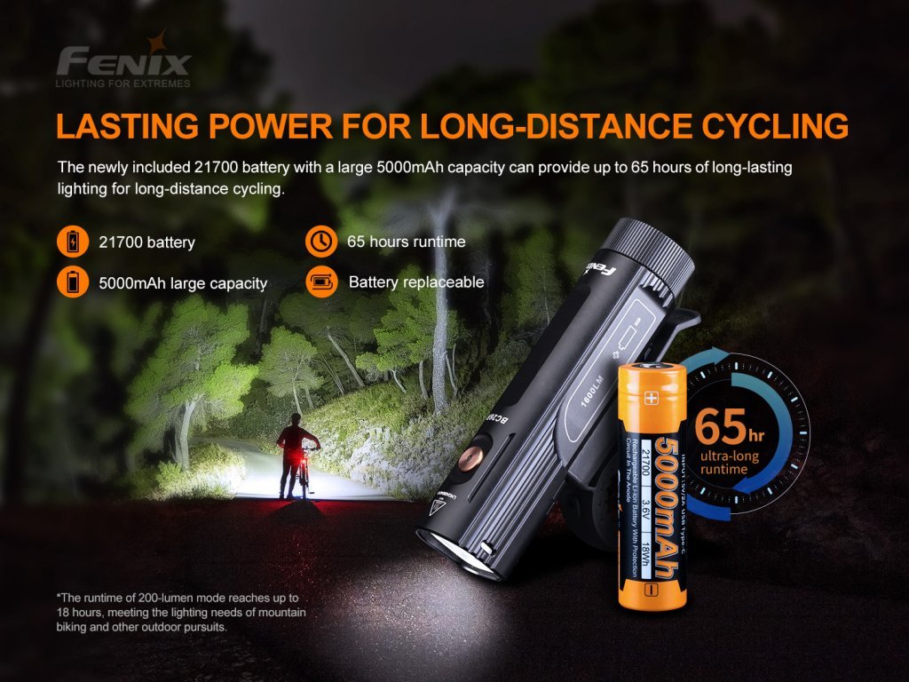 Výkonná nabíjecí cyklosvítilna Fenix BC26R přináší světelný tok až 1600 lumenů (ANSI) s dosvitem až 169 metrů. K napájení slouží vyměnitelný Li-ion akumulátor typu 21700 o kapacitě 5000 mAh, který je součástí balení a nabíjí se přes USB-C konektor přímo ve svítilně. Světelným zdrojem je moderní dioda Luminus SST-40. Speciálně vytvořená optika vytváří velmi široký světelný kužel, který plynule osvětluje celý prostor před jízdním kolem v úhlu 100°, takže svítí i v místech, které běžné cyklistické svítilny nepokryjí. Design držáku umožňuje rychlou montáž i demontáž světla na řídítka bez použití nářadí, držák navíc umožňuje rychlé vyjmutí svítilny, takže ji lze použít i jako vysoce výkonné ruční světlo. Držák lze použít na všechna řídítka s průměrem od 22 až do 32 milimetrů. Fenix BC26R nabízí celkem pět digitálně regulovaných režimů výkonu s výdrží až 65 hodin a nechybí ani blikání. Cyklosvítilny Fenix vám zajistí kvalitní osvětlení na noční tréninky, pravidelné dojíždění do práce i na vytrvalostní závody.