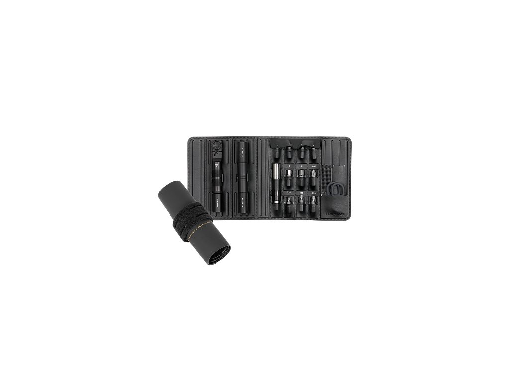 Kompaktní srolovatelná multifunkční sada nářadí s ráčnou, sadou na opravu bezdušových pneumatik / sadou na huštění CO2. Ideální společník na cesty. Ráčnový mechanismus s jemnými zuby, reverzní páčka a kolečko pro rychlé otáčení. Sada obsahuje držák bitů Speed Sleeve, nástroje z tvrzené oceli s imbusem 2, 2,5, 3, 4, 5, 6 mm, bity T10, T15, T25 Torx®, bit křížového šroubováku #2, hliníkovou hustilku CO2, nástroj na vkládání 3,5 mm knotů, knoty na opravu pneumatik. Ultrazvukově svařované rolovací balení udrží věci uspořádané a bezpečně uložené, a dokonce má kapsu na uložení dvou silikonových pásků pro přenášení jedné 16g CO2 kartuše a dvou montpák na pneumatiky.